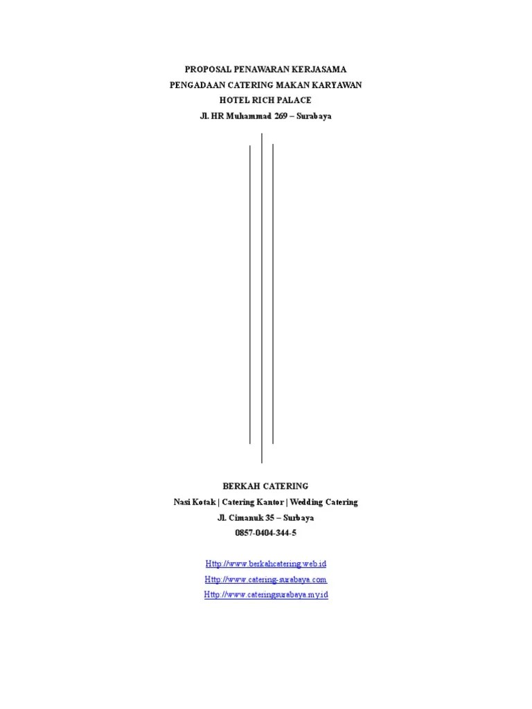 contoh proposal penawaran kerjasama catering. proposal usaha berkaitan dengan dunia usaha dan bisnis, baik itu individu maupun kelompok. Saya berharap, semoga proposal penawaran ini direspon dengan baik oleh pihak kaoskata2.com. contoh surat penawaran harga barang jasa dan kerjasama makanan surat keuangan. contoh surat perjanjian kerjasama spk antara cv pamoyanan dengan salah satu sekolah pemesan pemasangan kontruksi atap baja ringan di kabupaten garut cv pamoyanan. Karena dalam syarat administratif bank kata "berpengalaman 2 tahun" Pahami trust, safety dan profiability Berdasarkan fungsinya, proposal ini dibagi menjadi dua yaitu proposal usaha (business plan) dan proposal bisnis (business proposal).business proposal atau proposal bisnis adalah media tertulis yang berisi dokumen penjualan seperti informasi standar tentang cakupan proyek, produk yang ditawarkan, biaya dan jangka waktu. Surat permohonan kerjasama format dan contoh surat kerjasama. Fakta rahasia dari buku "yg judul & Kondisi tersebut jika tidak diatasi, akan membuat penurunan kinerja perusahaan atau bahkan kehilangan klien / customer. proposal dibawah ini akan membahaas mengenai pengajuan kerjasama dari suatu perusahaan periklanan yang dengan. 30 contoh surat lamaran kerja terbaru berbagai pekerjaan.