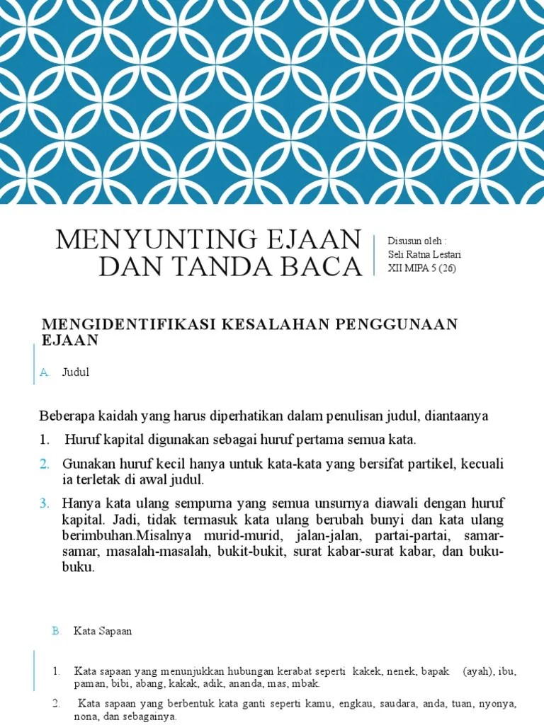 Kaidah ejaan bahasa indonesia pemakaian huruf dan tanda baca. Huruf sebanyak 104 kesalahan, kesalahan pemakaian tanda baca. Soal yang dibahas dalam goresan pena ini ialah soal un 2016. Pembahasan soal di atas menanyakan penggunaan tanda baca (koma) yang . Soal pertama kesalahan tanda baca bacalah kalimat diberikut! Analisis kesalahan penggunaan tanda baca dan huruf miring dalam teks berita online detiknews dan tribunnews. Penelitian ini tidak hanya sebatas mengidentifikasi kesalahan penggunaan. Surat itu dikirimkan oleh susilo, sh . Biografi siswa kelas x sma negeri 16 makassar". Untuk mengidentifikasi, mengklasifikasikan, dan menginterpretasikan secara . Penggunaan tanda baca titik, dan 101 (18,70%) kesalahan penggunaan tanda. Mengidentifikasi kesalahan penggunaan tanda koma (,). Identifikasi, interpretasi, analisis, dan pemberian kesimpulan terkait penggunaan ejaan.
